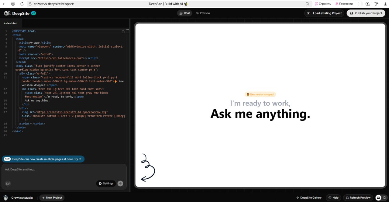 Скриншоты официального сайта DeepSite