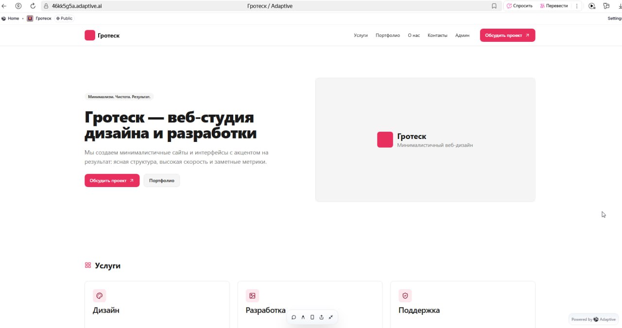 В начале сервис создает лендинговую страницу с визуалом (без сложных кодов). А потом вы можете дополнять ее через новые запросы и уточнения. Удобно, что некоторые кнопки работают. Например, при нажатии на «Обсудить проект» появляется форма обратной связи. Для вас создаются все необходимые разделы, которые нужно дозаполнить вручную (изображения, текст, видео и т.п.). Вид страницы можно адаптировать под разные устройства, и это получается действительно красиво. Минус – нелогичные детали запроса отображаются на самой странице. Все можно исправить дополнительной командой, но это достаточно кропотливая работа. Чтобы внести новую информацию = нужно ее внести, сервис не будет придумывать удаленные фрагменты текста повторно.