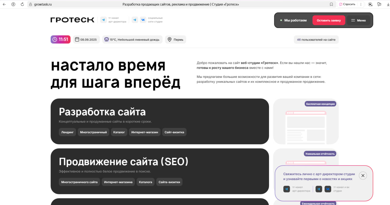 А если не хотите заморачиваться и разбираться – доверьте разработку сайта нам! Кому нам? Программистам, дизайнерам и маркетологам студии «Гротеск».
