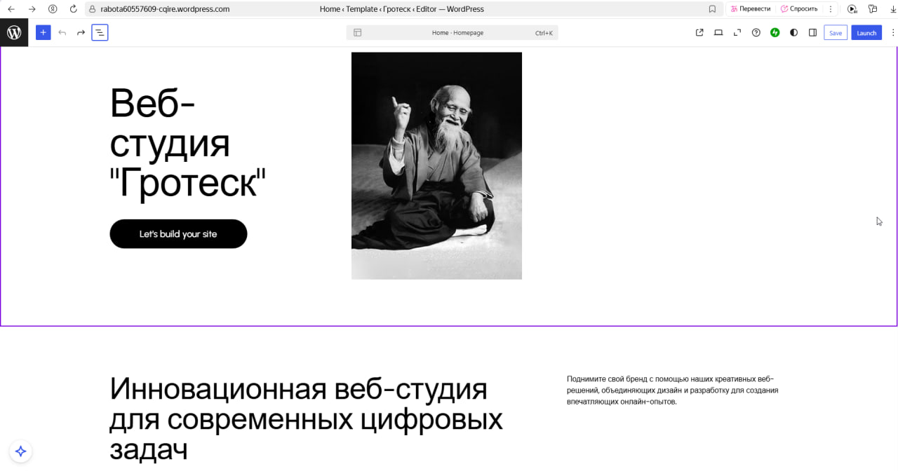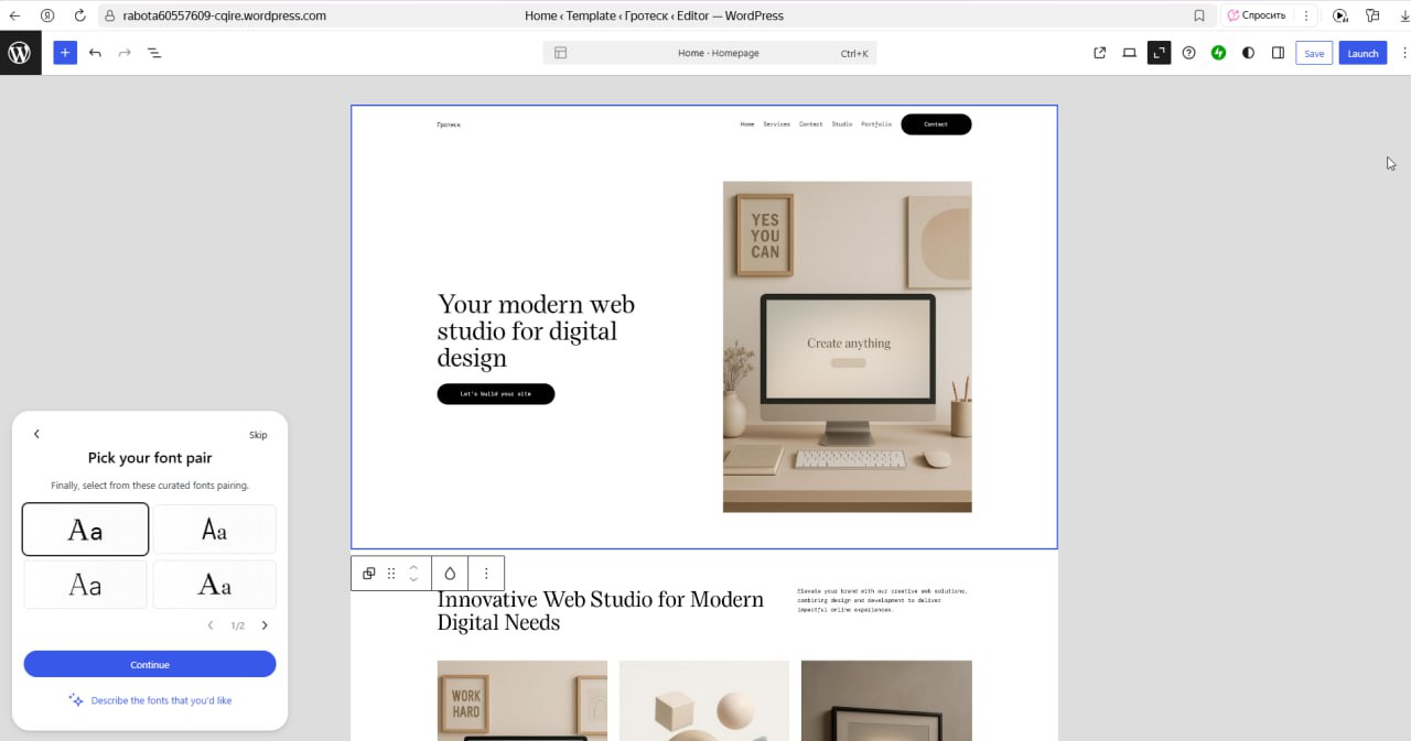 Сервис на английском языке с возможностью редактирования визуала – огромный плюс. Можно выбрать сочетание цветов, шрифт и добавить свои изображения. Функционал напоминает Tilda, и освоить его несложно: необходимо перетаскивать изображения и вписывать тест прямо в готовый макет. Это однозначное преимущество над всеми испытанными выше вариантами. Общение с нейросетью происходит в том числе и в форме вопросов, которые подсказывает сервис. В качестве минуса можно отметить вынужденный ручной перевод большинства разделов.